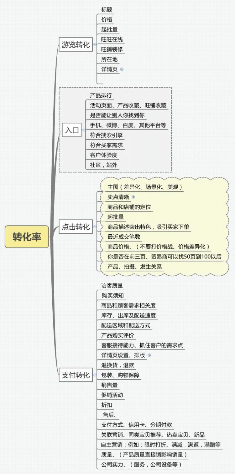 (3)转化率。这个环节非常重要,它分为浏览转化率、支付转化率、点击转化率等。具体涉及哪些因素及具体场景等,我们将在图2-1中告诉你。