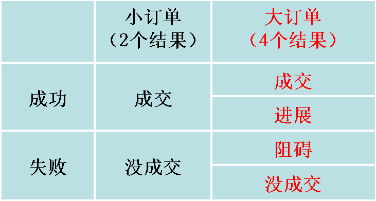 本书研究的是B2B行业工业品销售,单笔金额大或累计金额大的大订单;而B2C消费品销售一般是小订单,就是买一盒牛奶、一包纸巾。如果你是B2C小订单,每次拜访客户只有两个结果:成交和没有成交;如果你做的是B2B大订单,客户决策时间长、决策过程复杂,新客户的开发少则几个月长则好几年,这个过程的销售拜访有可能数十次,每次拜访不仅仅是成交和没有成交那么简单。事实上每次拜访有四个结果,分别是成交、进展、阻碍、没成交。