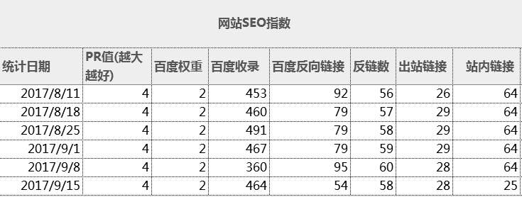 注解:本表一周统计一次,选择一个站长测试工具进行统计记录,其中PR值(0~10)、百度权重(0~10)、百度收录、反向链接、反链数站内链接都是数字越大越好,出站链接不能多于反链数,最好控制在30以内。这些数字的异常变化,可能是网站的哪个功能出了问题。表7-6站内链接突然掉到25个,可能是正文的链接功能被关闭了。让这些数字(除“出站链接”外)持续加大,是SEO优化的目标。