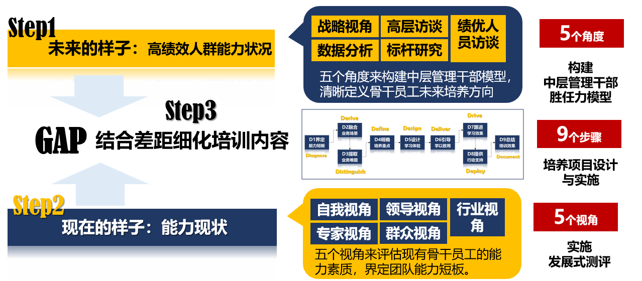 测训一体开端是建标准,建标准从战略视角、专家视角、标杆视角、绩效视角、岗位视角所构建的企业未来对岗位人才的要求,是培养成功时候的样子,而通过人才测评所得到的是待培养人群的能力现状;缩短现状和成功时候的差距,培训就是其中的路径之一。建标准和做评估的过程就是针对该岗位系统化的调研过程。这样的调研使用多种手段,包括高绩效访谈、数据分析、标杆比对、战略演绎等,使调研结果能够全面反映员工的能力现状、关键业务开展的难点和挑战点,以及与之相关的制度和文化可能存在的相关问题等,结果的指向性更强,进而有利于通过培养和绩效改进提升关键岗位员工绩效。