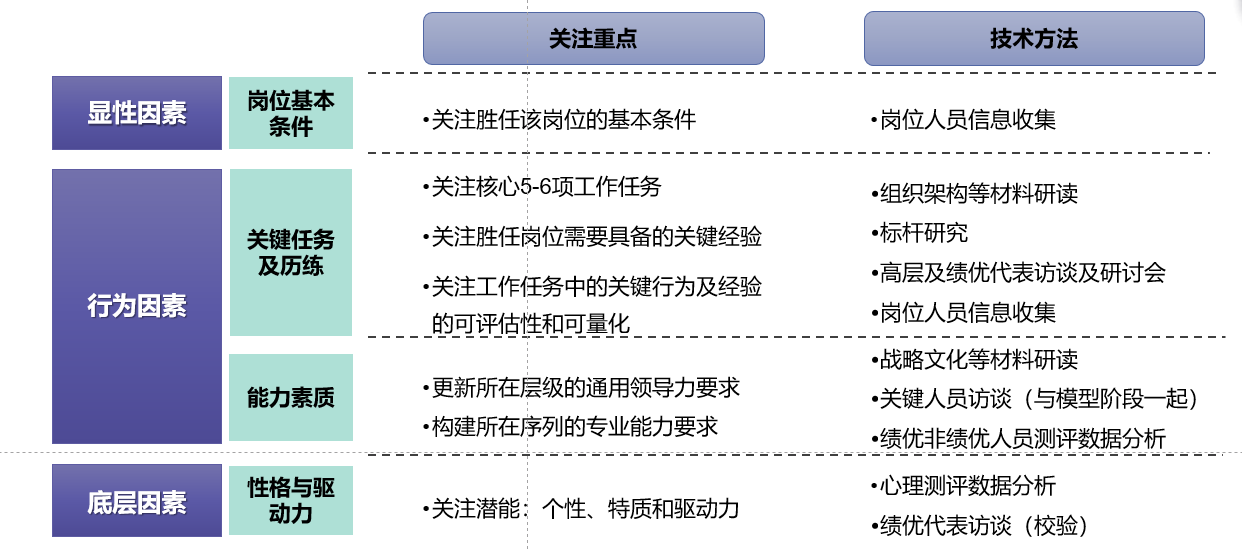 显性因素、行为因素、底层素质方面内容越精准,对培训发展的指导作用越强。尤其是行为因素,他们对培训的支撑度主要体现在,岗位所需要具备的关键经验背后是该岗位需要完成的核心任务。核心任务的完成依赖于关键行为的支撑,关键行为点背后是知识、态度、技能的支撑,而关键行为也是我们进行胜任力模型能力指标萃取的依据之一。
