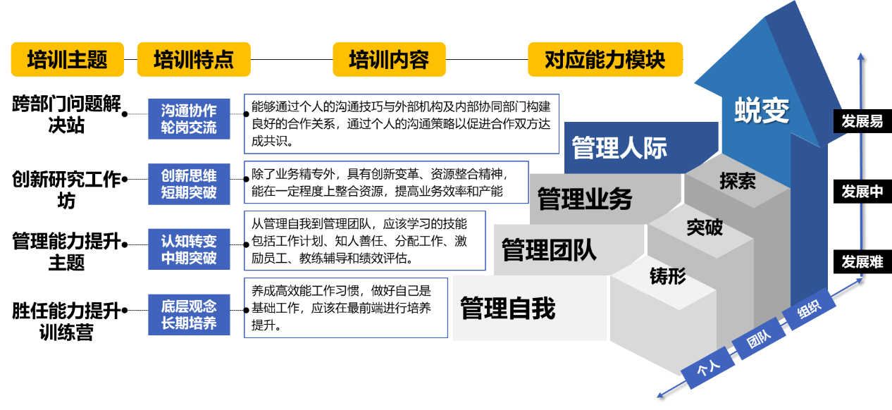 第四,在培训的规划方面,进阶式培养和跟进全面解决培训体系的系统性规划问题。