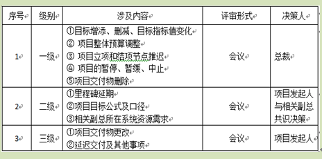 第二步,如果项目变更为一般变更,那么只需要项目组组织内部评审,项目经理签署评审意见后对相关文档进行存档,完成变更入基线即可。如果项目变更为重大变更,则项目经理需将《项目变更申请表》提交至PMO,然后由PMO根据重大变更分级的决策标准,确定评审形式及决策人。