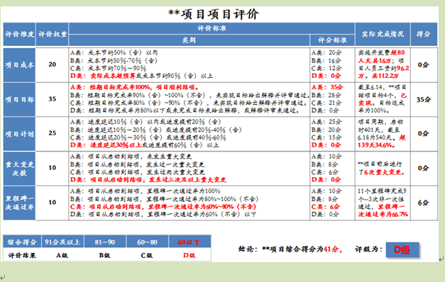 以项目结项会的召开为标志,项目就结束了执行阶段,进入项目验收阶段。德邦会对项目成果进行评审验收,并评估项目绩效。与此同时,项目组将和PMO一起对项目进行收尾,包括释放资源、财务结算、技术成果移交及归档、项目经验教训收集等。其中,项目绩效评价,是德邦较有特色的做法。
