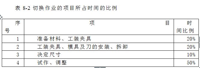 一般说来,在作业切换时间中调整时间占了50%左右(表8-2)。在企业里,往往没有人仔细去研讨调整发生的原因及调整的作业内容,哪些是可以避免的,哪些是无法避免的,对无法避免的部分应研究如何缩短其时间的方法。