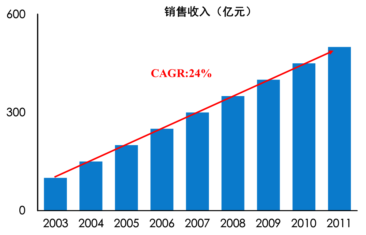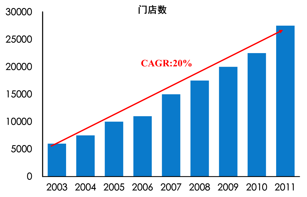 2003 年以来,随着我国经济的高速发展及居民收入的提高,便利零售业态也进入了高速发展阶段。从2003年到2011年,中国便利店门店数和收入复合年均增长率分别达20%和24%。9年间,便利店的门店数和收入都增长4倍多,2011年便利店门店数达27600家,收入近500亿元。如图3-18所示