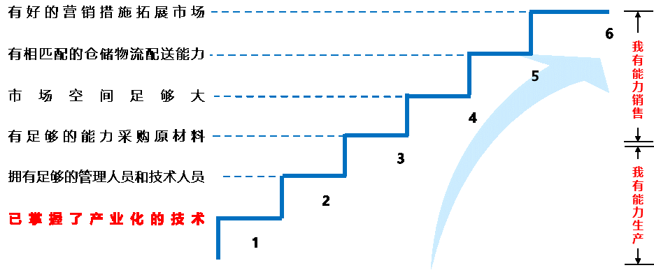 一个募投项目生产的产品除了有广阔的市场空间,还需要企业有雄厚的技术实力和先进的生产设备及成熟的工艺,才能生产出优质的产品,赢得客户的认可,才能获得市场份额,从而取得竞争优势。在“我有能力生产”的三个因素(已掌握了产业化的技术、拥有足够的管理人员和技术人员、有足够的能力采购原材料)中,“已掌握了产业化的技术”是关键。如图2-10所示。