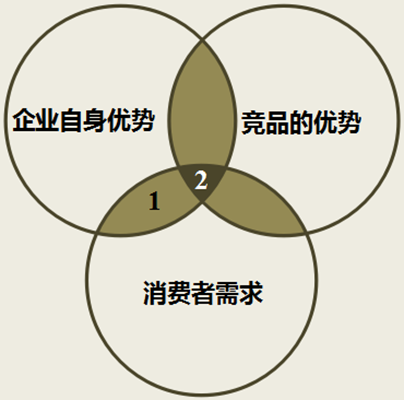 (2)如果在“1区”中没有找到这种连接点,则需要分析竞品的优势、消费者需求和自身的优势。在这个过程中,由于这种优势竞品也具备但没有对外传播过,则企业可以在“2区”中寻找和消费者的联系,利用先发优势,占有该资源。