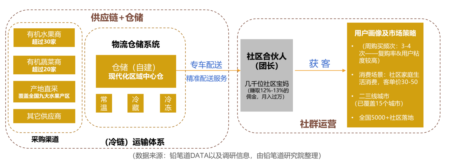 这个项目起源于南京和天津,2018年4月上线。十荟团市场定位在二三线城市, 瞄准熟练应用微信,并且有高品质生鲜产品需求的家庭,通过在线上微信群发展吸收团长(或者叫社区合伙人)实现顾客资源,再通过微信群或小程序进行预售,从中抽出12%~13%的佣金作为团长提点;线下则是用户到团长店里自提。同时,十荟团通过自建供应链完成商品采购、仓储、配送。商品配送为了实现高效、精准的配送服务,采用专车配送。如图5-8所示。