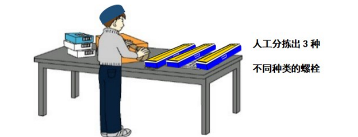在装配场景中,低成本自动化适用于装配、加工及仓库管理等方面。有工人需从三个盒子里手工拿不同零件(如螺丝、螺母)到工位装配,每天操作费力且增加工时。