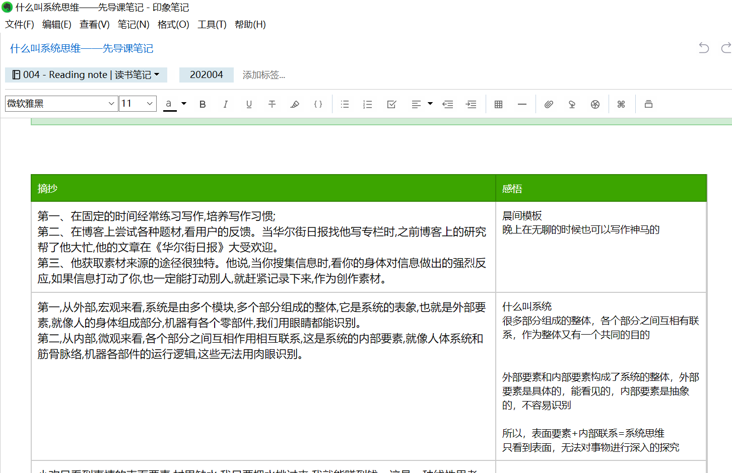 再次阅读,将第一天标注出的重点信息和知识点复制到2×1的表格中,左边摘录,右边写感悟或实践措施。如图7-9所示。