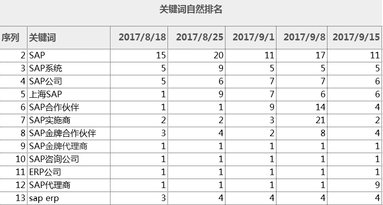 注解:该表每周统计一次,用于检查优化中的关键词排名,对于优化工作具有指导作用。