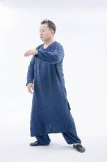 8.左脚踩下将重心平移至右脚心,同时左手画半圆至左胸前,松肩垂肘,左肘不超过肩膀高度,右手松掉护裆于右腿内侧。