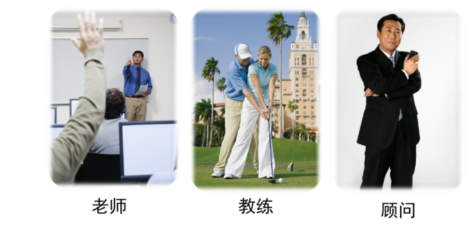 (3)从对比的角度讲:培训师比传统的教师有更多的角色,如培训师、教练、绩效顾问。从不同的角色上来说,有不同的要求,培训师的要求是编写教材和课程的讲授;教练是教导指出学员的不足,让他的行为符合规范;顾问是解决学员在你的领域所遇到的问题,给予一个思路、一种方法。