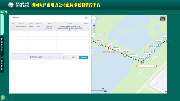 检修作业中,平台将班组计划中某条线路的停电检修计划派发至作业终端,现场作业人员根据标准化作业流程开展停电、验电等工作,将拉开XX开关、在XX处封挂接地线等现场安全措施发回至系统,同时,应用技术手段对临时接地线的封挂位置和挂接状态进行回传,当其他班组再次进行作业是,可以通过手持移动终端随时查看已有的安全措施,确保安全作业。