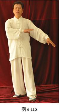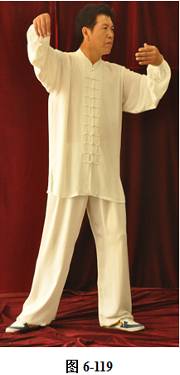 注意:单鞭在整套拳架中,起着承上启下的作用,应该注意中正。上身不可前倾,肩背不要倾斜。要呼吸自然,如欲左顾,则眼神领先于左顾; 欲右盼,则眼神领先之右盼。总之,要做到处处神意领先, 才能做到意到气到。
