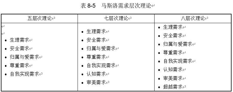 拉罕·马斯洛(Abraham Maslow)提出的。他认为人的需求是有不同层级的,这些需求成金字塔结构,在一种需求获得满足或部分满足之后,另一种需求就接着要求被满足。起初,马斯洛将人的需求分为五个层次,后来又增加到七个层次,再后来增加到八个层次,具体的需求层次如表 8-5 所示。