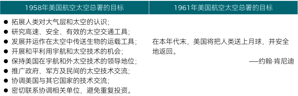 举例:NASA在1958年有众多的目标,每一个看起来都非常关键,但民众始终搞不清楚在NASA投入了那么多的人力物力财力究竟在干什么。于是在1961年肯尼迪上台以后明确提出,NASA的目标是:在本年代末,美国将把人类送上月球,并安全地返回。这一目标不但瞬间清晰了NASA在做的事情,而且瞬间激发了所有美国人的向往,无数科学家为这个目标趋之若鹜。终于在1969年7月21日,美国的“阿波罗11号”宇宙飞船载着三名宇航员成功登上月球。美国宇航员尼尔·阿姆斯特朗在踏上月球表面这一历史时刻时,曾说出了一句被后人奉为经典的话:“这只是我一个人的一小步,但却是整个人类的一大步。”