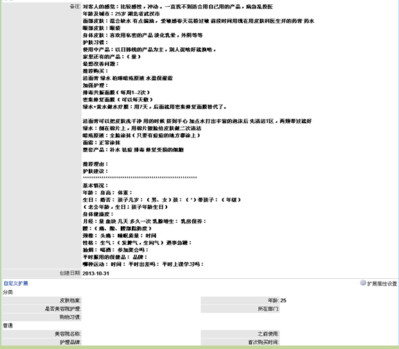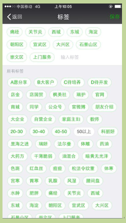 微信标签:客户类别(A、B、C、D类)+分店店铺+使用的品牌+地区+社会关系+护理项目等30项。