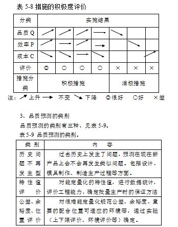 在品质预测的着眼点中,提出要采取积极措施,使问题不发生。这里所谓的积极措施是指可以提高产品品质、提高作业效率(例如防止失败、重复再作业等),减低成本(消耗材减少等)的措施。若从品质(Q)、效率(P)及成本(C)角度出发来评价措施,则从表5-8所示的情形中可以分出什么是积极措施。