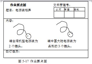 我们在制造过程中常出现的品质问题许多是由于管理方法不当造成的。应通过变更(或新建立新的)管理方法,防止同类不良的发生。例如机型相异零件使用错误,如果事先由班组长做好机型相异零件一览表,每当机型更换时再由该工序作业人员依清单要求做记录。通过这种管理方式,保证机型相异零件不被误用。如果某些机型相异零件十分相似,识别不容易时,最好将实物的对照图做成标准。同时,用一句简单而准确的语言表述不同之处。此标准可称为“作业要点图”(图5-17)。将“作业要点图”悬挂于使用工序上。当然,作业要点图依据的情报是作业指导书。同时,要符合ISO9000要求的文件的管理方法。
