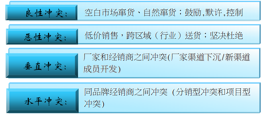 渠道冲突往往是以牺牲厂家的长期利益为代价,渠道冲突短期甚至还会促进销量。当渠道冲突发展到一定程度,所有的渠道成员都会离厂家而去,经销商前期的投资也会有损失,但不做这个品牌,至少还有其他选择,厂家却没有后路可选。因此,厂家不愿意看到渠道成员无序的市场行为,要求对渠道冲突进行某种程度的控制,所以处理渠道冲突也是渠道经理日常管理中一个重要工作。渠道冲突可以分为垂直冲突和水平冲突,前者是厂家和经销商之间的冲突,后者是同品牌经销商之间的冲突,水平冲突又分为良性冲突和恶性冲突,厂家如何应对这些不同类型的冲突?