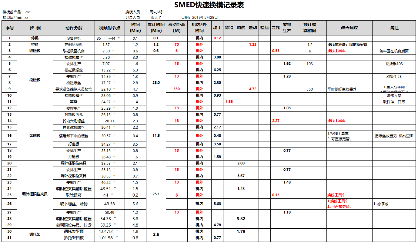 所以,我们以此改善为目标,原来设定的换模标准时间为2个小时,我们初步设定目标为1个小时,将费用降低一半。