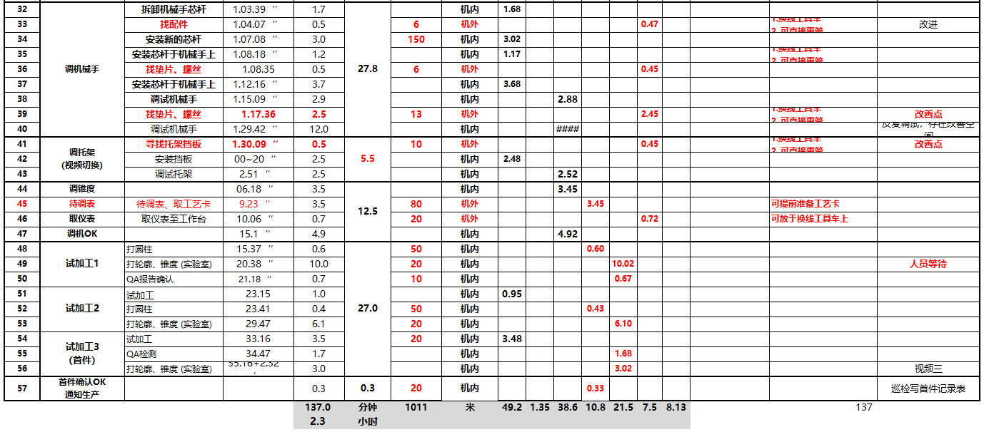 从表3-13中可以看出,其实在操作的过程中,员工还不一定在2个小时内能完成换模作业,根据录像分析得出实际总换模时间为2.3小时。从表中可以看出很多的问题点,比如: