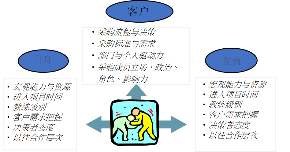 选择什么样的竞争策略跟三个要素有关系:第一是自身、第二是友商、第三是客户。从自身的角度来讲,它跟两个方面有关系,我们前面已经讲过了,第一是宏观:能力和资源;第二是微观:关系和活动。宏观包括品牌、产品、服务、价格、成功案例等,你的优势是什么?你的劣势是什么?微观包括进入项目的时间、教练级别、客户需求把握、决策者态度等,你的优势是什么?你的劣势是什么?反过来,友商也是一样。第三个因素跟客户有关,客户的采购流程和决策、采购标准是什么?他的部门和个人的驱动力是什么?采购组织立场、政治、角色、影响力?