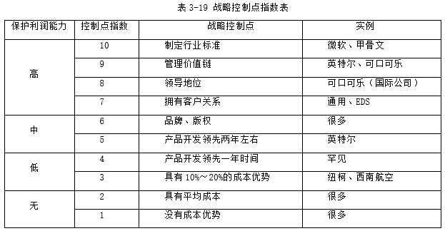 根据表3-19,我们可以清楚地看到,现阶段中国绝大多数企业的战略控制点位于控制点指数1~4之间,少数企业能冲到5~6,7以上的企业凤毛麟角。这也是为什么战略规划阶段很多企业大谈特谈战略意图、市场洞察、创新焦点,却不能将业务设计谈透做深,因为企业保护利润的能力实在偏弱。