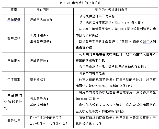 这七条调整意见,重点思考和回答了以下命题:产品愿景、目标客户、价值定位、价值获取、战略控制、业务边界、组织能力和风险管理等8个核心问题,其实这就是华为终端BG管理层对手机业务所进行的全新的业务设计,见表3-20。