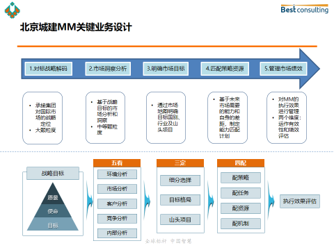 百思特顾问团队从国际化战略梳理、区域市场策略到营销能力升级三个维度,为北京城建国际事业部量身打造了一套组织变革和营销体系方案。百思特建立了一套适合城建国际部的MM管理流程,等于出海开拓先有了一份航海图。即结合行业分析报告,邓白氏风险评估报告以及一线信息收集,进行海外市场洞察和风险剖析,从政治、经济、文化、安全等多方面扫描,利用标杆企业的市场管理模型,“五看三定四配”筛选出适合北京城建国际事业部的价值区域和价值国家(见下图)。