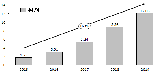 2015年,它的净利润还不到2亿元,2019年则增长到12.06亿元,年复合增长率达到63%,这个速度是十分惊人的。
