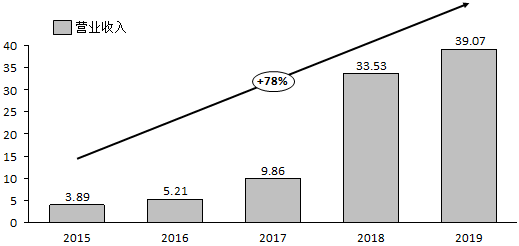 营业收入的增长速度更加惊人。2015年不到4亿元,2019年已经达到39.07亿元,4年增长了近10倍,年复合增长率达到78%!