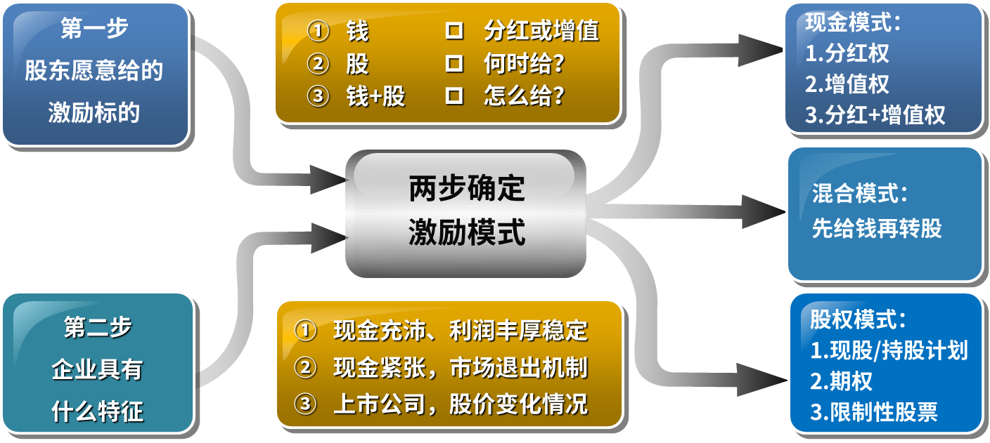 第一步,明确股东愿意给的激励标的是什么。如果只给股份,则采用股权模式,再追问是愿意现在就给还是满足一定条件后再给?现在就给即为现股模式;满足一定条件后再给即为限制性股票或股票期权模式。如果只给现金,则采用现金模式。在现金模式下,再问是否确定只是分红,如果确定即为分红权;如果不仅仅是分红,基本上就是增值权或者分红权加增值权。然后,明确是“一年一清”还是“逐年分配”。如果既给股份又给现金,则为组合模式。在组合模式中,如果是将要兑付的现金发放一部分、预留一部分,并将预留部分转为股份,则采用“钱转股模式”;如果在某种条件下给现金,在某种条件下给股份,则采用股权模式加现金模式。再进一步追问,就可以了解具体采用何种股权模式、何种现金模式。