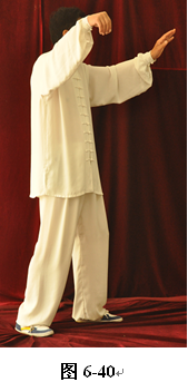 接上式,挤出后,腰微含,右腰向左上方提转,眼神及右脚皆随之转动,右脚向左内转,脚尖转向西南,身体转向正南,顺势右手上翻,手心朝上成穿掌式,左手不动,腰往后微拱,成下採之式,将左右两手拉回右腹前,腰向右外旋转,身体转向西南,左手随转离开右手腕,落至右侧胯上端,面部侧向西北,右手翻转,掌心向下斜指向西北于右胯侧外,重心移落右腿。用左腰提起左脚,脚尖朝向正南,与左肩平行向前迈小半步的距离(见图6-31至6-42)。腰向上提走弧形,两臂随腰向左上划弧,身体随提腰转向正南,两臂抬至略高于肩,重心移向左腿;腰向左撑,随之后拱,带动两臂向左外下划圆收回腹前,重心移向右腿。收回时,左掌翻转掌心向上,右掌心向下两掌微微相合,腰微含,向右侧缓慢旋转打出右肘,腰回转面向正南,眼神转向右平视,腰微拱,随之上提,带右臂往右前方送,右手五指撮拢,指尖朝下变勾手状。臂抬略高于肩,左手仍置腹前,左腰向左外旋转,提左膝身体随之旋转,左脚向左侧迈出一步,右脚尖随身转体内转,朝向东南,身体面向正东。左腰轻轻向上提,借势左手向前打开成掤式,重心前移成左弓步;腰微拱,后腿膝微屈,重心移向右腿,左手随之翻转掌心向下按,眼神向前平视。