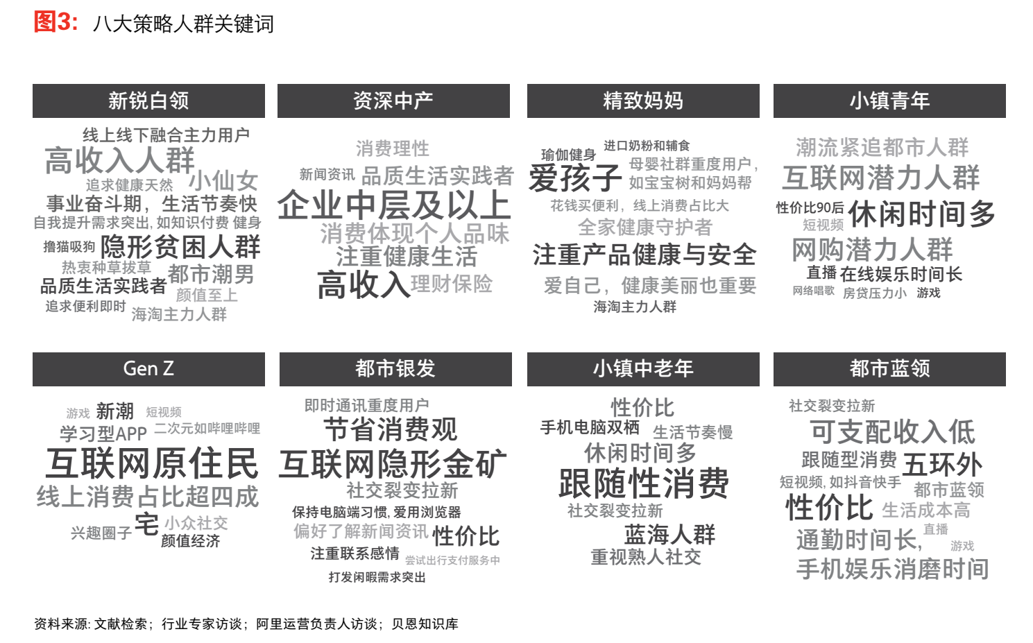 在天猫食品和第一财经数据中心的一次面向全球范围内首次将该量级的数据系统性地运用到消费者人群划分的调研——《2020天猫美食消费趋势报告》显示,有八大特征鲜明的策略人群:新锐白领、资深中产、精致妈妈、小镇青年、GenZ(Z世代)、都市银发、小镇中老年和都市蓝领,约占大快消平台用户数的八成,贡献九成以上的销售额。