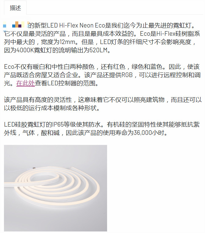 图5-1:某LED灯条公司产品A描述截图(Google自动翻译)