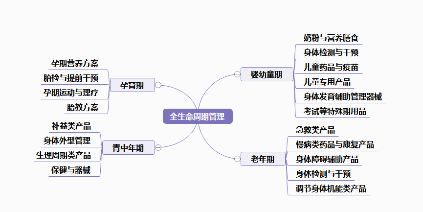 大健康产业是围绕人生命周期进行的产业布局,涉及各类与健康相关的信息、产品和服务,也涉及各类组织为了满足社会的健康需求所采取的行动。大健康的概念属于国内特色,用简单通俗的表达方式就是做人的全生命周期管理。与健康和生命关联最密切的就是医药行业。因此,大健康的理念最早被传导到医药行业,尤其是在制药企业苦苦求索转型机会的时候,最早涉足了饮品和日化行列,其中不乏成功者。对于大健康的理解,我们可以用一个图来直观地看到其中的脉络,从人的孕育到死亡,一生中对于健康的追求目标是永恒的,因此,对生命周期全过程的需求进行梳理完成机会细分和服务满足是大健康理念中与医药行业密切相关的。大健康思维下,医药代理商可以重新进行资源组合,在细分市场中找到机会。如图11-1所示。