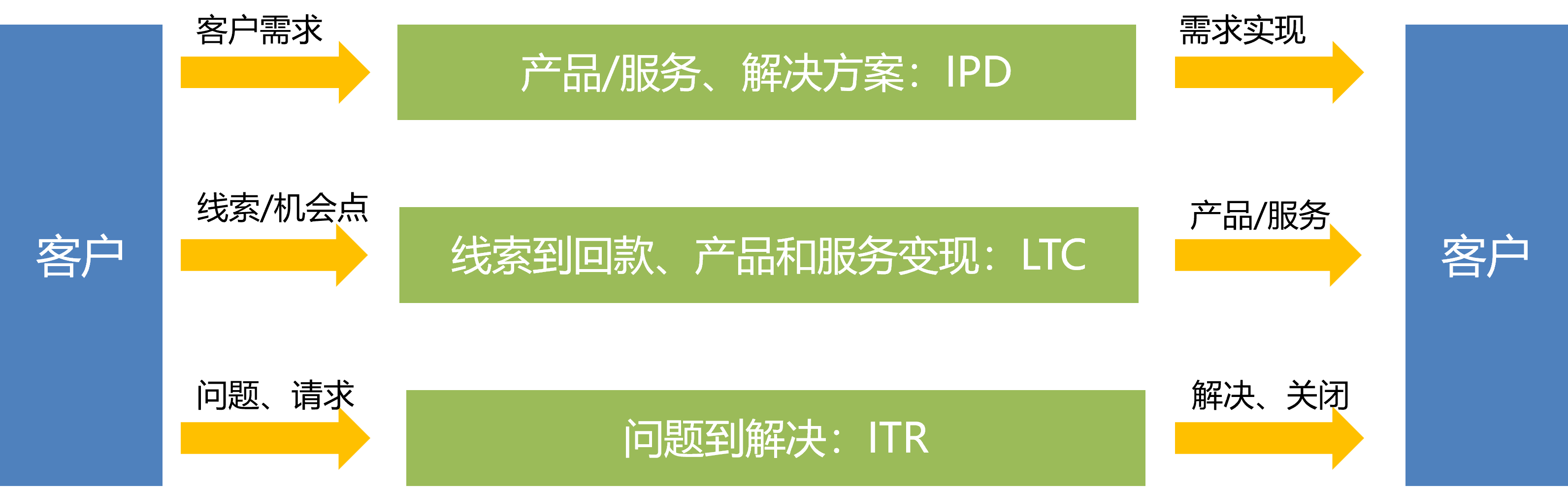 这三件大事,起点和终点都是客户。从客户中来(需求、问题)最终又回到客户中去(实现需求,问题解决,价值变现)的过程,就是业务流,如图4-10所示。