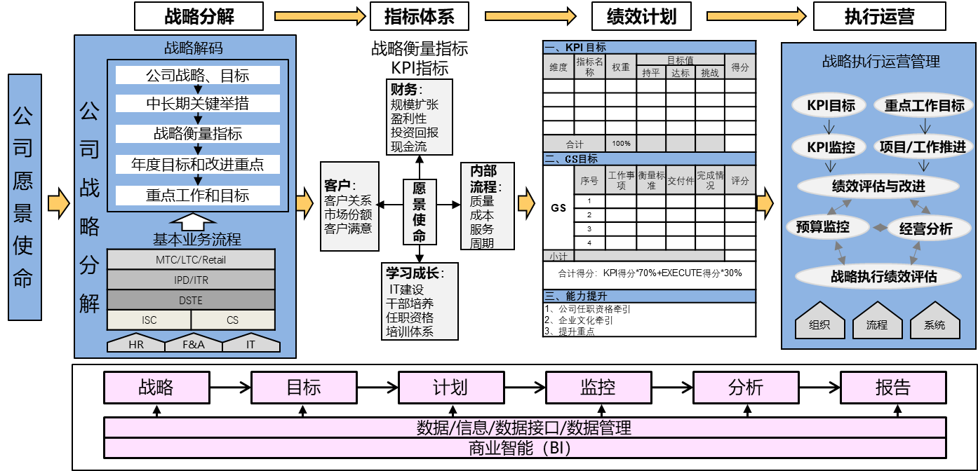 前三项工作的完成,通常在市场管理MM流程中去分析和定义。MM流程是IPD的一个子流程。重大项目会按照IPD\LTC\ITR来进行分类分层管理。关键任务是依据三大业务流程的角色定义和工作方法,识别出执行各项目中的重点工作(比如客户需求分析、目标客户筛选、质量问题回溯等)。所需资源是人、财、IT等在业务流中的对应关系。正是基于明确而清晰的流程,员工才知道要做哪些事情?正确的方法是什么?输入条件是什么?输出的标准是什么(交付的时间、质量、成本标准)。正是基于流程,BP的落实可以做到纲举目张、执本末从。