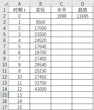 这样就得出了第1期的水平值为9919,趋势值为9808,预测值为13693,并如此类推,可以得到后续各期的水平值,趋势值和预测值。