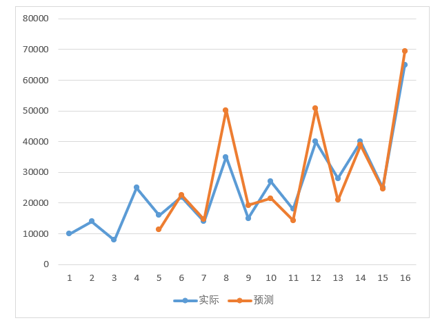 通过第16期的数据来预测第20期,两者相差了4期,因此有4 X 2081的发生。而实际就是第16期的季节性数值,为