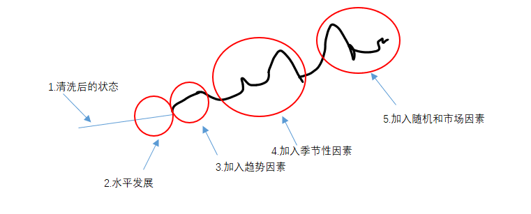 从线条图4-21来看,可以视为如下发展。从还原后的水平,水平发展,再分别加入不同的因素。当然这个是思路图,不甚严谨,仅作参考。而所谓数据清洗,就是这个线图发展的逆向发展。