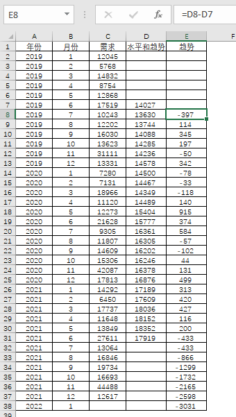 得出2021年6月的趋势是-433,那么后续的就以这个最新的趋势进行类推,2021年7月就是第一期的-433,即-433 * 1= -433 ,假如要推测2022年1月的,类推就是7期的数据,即-433 * 7= -3031