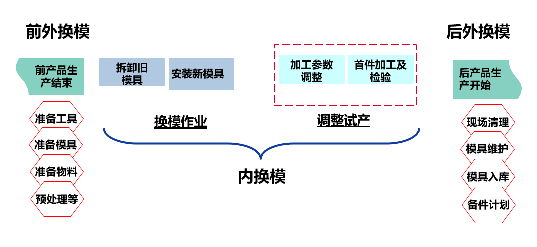 外部作业是指不需要设备或者机台停机就可以实施的作业内容,包括前外换模作业(换模前准备工作,如准备工具、模具、物料等)和后外换模作业(换模后的收尾工作,如现场清理、模具入库等)。