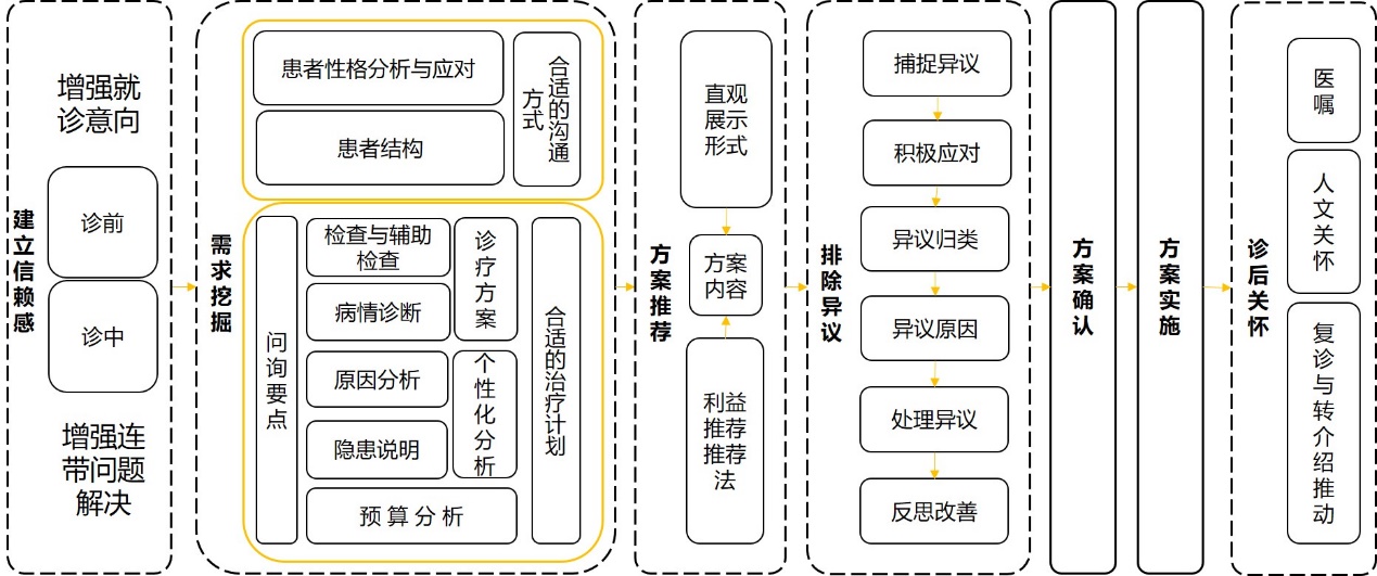 信赖感的建立是由患者进入诊室的那一刻就开始了,从最先接触的前台到后面护士、助理再到医生,每一个环节都是增强信赖的机会。所以,诊前要做到的是增强患者的就诊意向,而诊中的信赖感建立目标是要实现连带问题的解决,其实这既是建立信赖感的目标,也是检验信赖建立程度的指标。