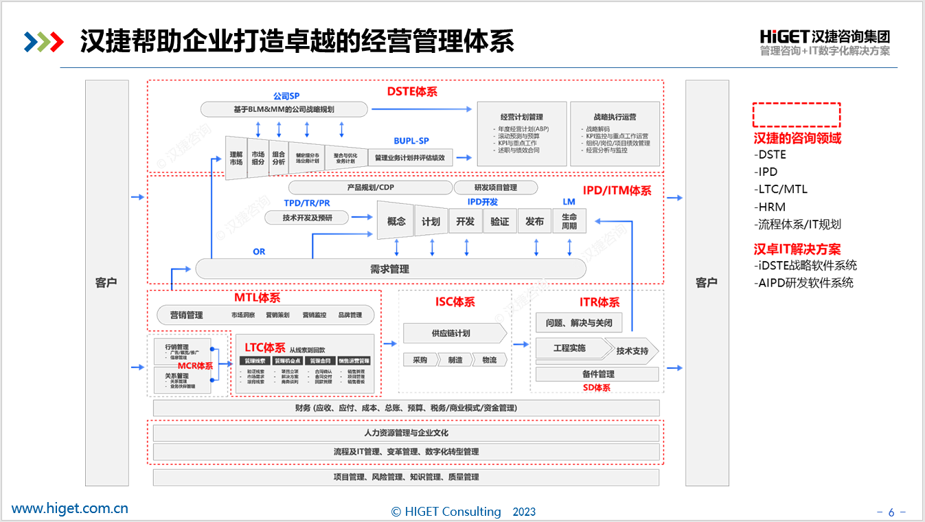 汉捷咨询——IPD咨询的开创者与引领者,落地式DSTE解决方案开创者,落地式LTC咨询开创者,21年来40+专业顾问的咨询及培训实践,为350+客户提供了700+成功咨询项目,12000+客户提供了培训服务。汉捷始终以【帮助企业实现卓越,成就伟大】为使命,【成为管理咨询与数字化解决方案的国际先锋机构】为愿景,帮助企业打造卓越的经营管理体系,助力企业做好5件事: