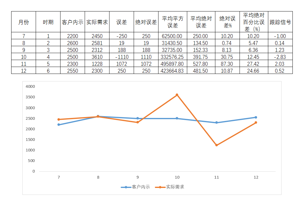 1. 就是预测的不准确性。尽管客户给了未来的3个月(1-3)的预测数据,分别是2000,1650和2700,但是根据历史实际需求和对应内示数据的分析,存在相当程度的误差性。
