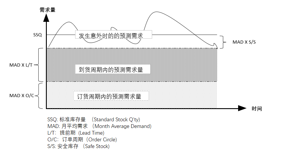 大鹏的脑海里已经习惯性地形成了相关的图示画面,他的订货策略就是设立一个标准库存量(SSQ),能覆盖两个不同周期内的需求的同时,也能覆盖一部分可能发生的意外时的需求量。